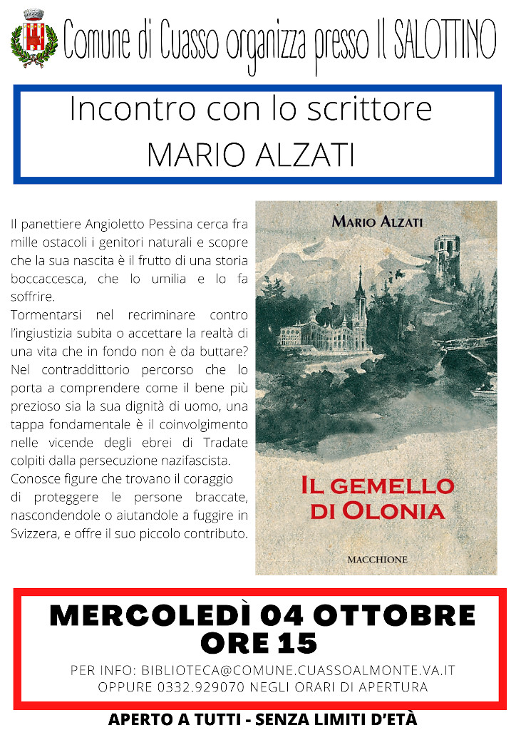 Il Comune di Cuasso al Monte organizza mercoledì 4 ottobre 2023 alle ore 15:00 (presso il SALOTTINO) l'incontro con lo scrittore Mario Alzati.